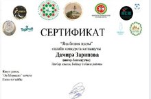 Тәрбиячебез Зарипова Дамира Данир кызы Халыкара онлайн "Яңа бишек җыры" конкурсының "Моңлы көй" номинациясендә катнашты.