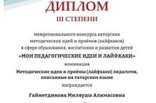 Воспитательница Гайнетдинова Милеуша Алимасовна участвовала в межрегиональном конкурсе авторских методических идей и приёмов (лайхфаков) в сфере образования, воспитания и развития детей. "Мои педагогические идеи и лайхфаки"