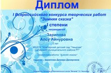 "Мэгариф" белем биру узэгенен, балалар очен оештырылган , "Зимняя сказка" ижат эшлэре конкурсында катнашып, Давлетшина Диана хэм Зарипова Алсу 1 нче дэрэжэдэге диплом белэн булэклэнделэр. Котлыйбыз!