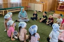 Без үзебезнең зурлар төркемендә тәрбияләнүче балалар белән мәчеткә юл тоттык. Анда безне үзенең ачык йөзе белән авылыбызның абыстае Тәслимә апа Сираҗиева каршы алды. Ул балаларны Изге Коръән, тәсбих белән таныштырып, намаз алу тәртипләрен аңлатты. Балалар Тәслимә апалары белән берлектә эшләп карадылар, һәр бала үзләре белгән догаларны яттан сөйләде.