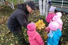 Дети с удовольствием поинтересовались у Александра Ивановича как у него дела, сложно работать или нет. Подарили ему осенний букет из кленовых листьев. Все попробовали поработать с инструментами уборки листьев.