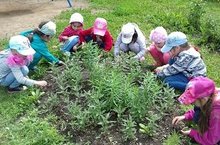 Балаларга хезмәт тәрбиясе бирү, яшелчә һәм чәчәкләрнең үсүен күзәтүне күзаллап балалар бакчасында, балалар катнашында эш алып барыла. Һәр төркем үзенең мәйданчыгында чәчәкләр үстерә, коры көннәрдә су сибеп, төпләрен йомшартып, чүп үләнләрен утыйлар. Чәчәкләрне танып белергә өйрәнәләр. Зурлар төркеме кызлары бик тырышып чүп утыйлар.
