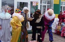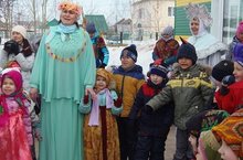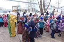 Весь праздник ребят развлекали весёлые скоморохи. В гости к детям приходила раскрасавица Весна, снежная Зима, Баба-Яга и Леший.