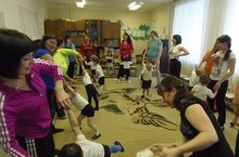 Воспитатели первой младшей группы организовали совместное физкультурное занятие с родителями "Как найти волшебные яблочки". Занятие разработано на основе психолого-педагогической технологии "Навстречу друг другу". Основные задачи: обогащать двигательный опыт детей, развивать координацию движений, ориентировку в пространстве. Помочь родителям установить эмоциональный контакт с ребёнком, расширяя диапазон их невербального общения.Содействовать возникновению у родителей и детей чувства радости, удовольствия от совместных игр.