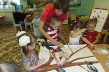 Воспитанники первой младшей группы вместе с воспитателем слепили елочку.