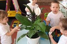Дети 1 младшей группы ухаживают за цветами.