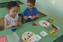 Цель: продолжать учить детей вырезать вписанные друг в друга фигуры типа тюльпана и розетки, учить вырезать листья, учить детей располагать элементы на круглой форме, подбирать их цветовые сочетания для украшения; воспитывать уважение к мастерам народного творчества,