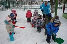 Ура! Наконец-то выпал снег. Ребята первой младшей группы принялись за работу.