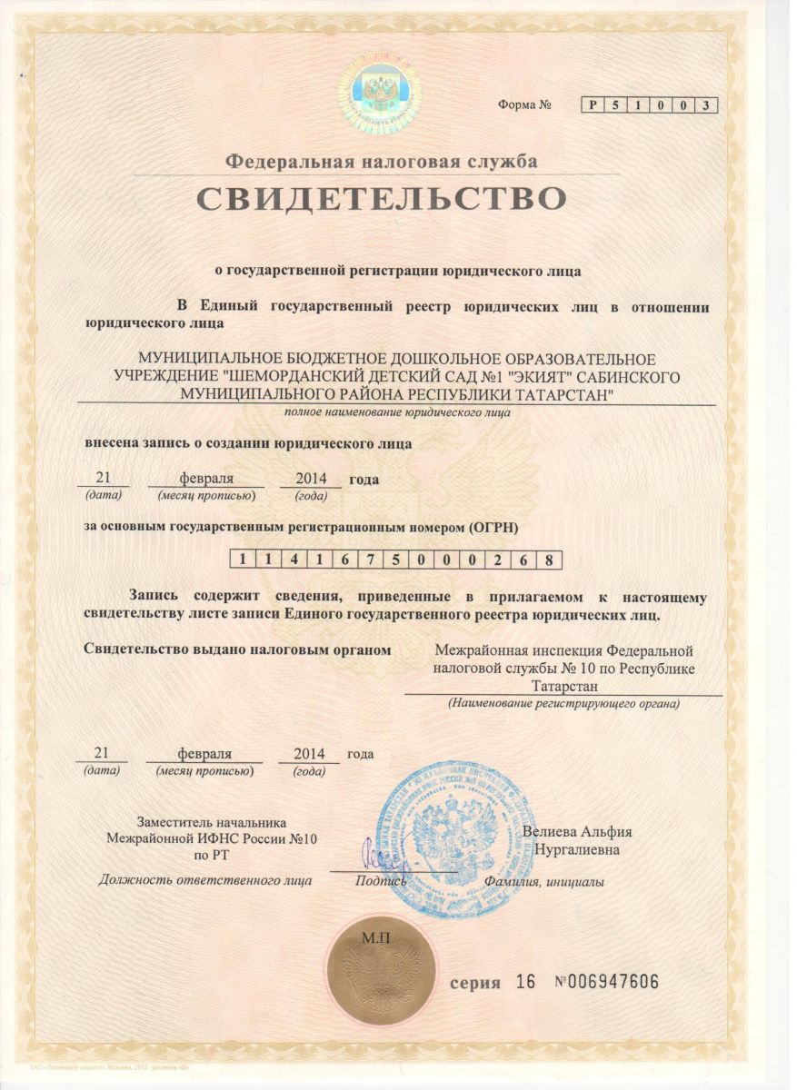 Свидетельство о государственной регистрации юридического лица
