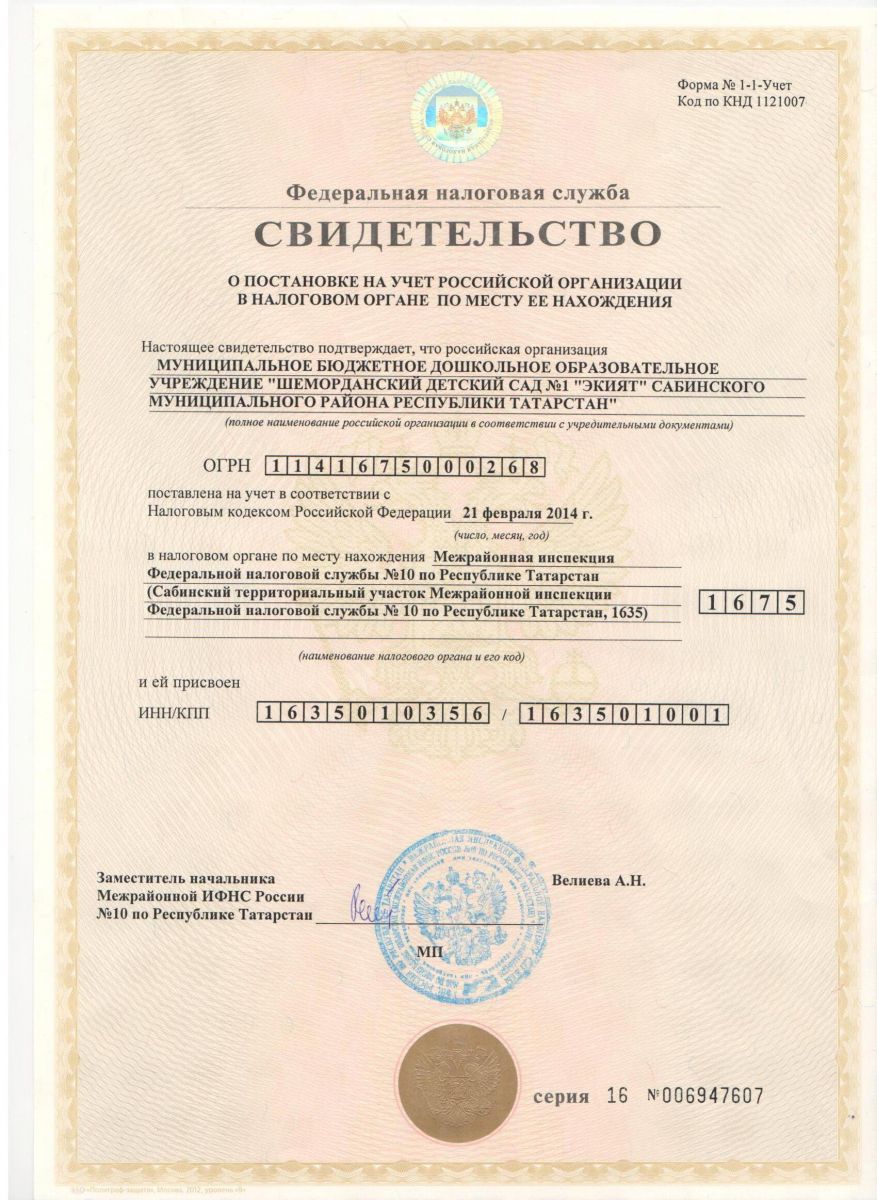 Свидетельство о постановке на учет Российской организации в налоговом органе по месту ее нахождения