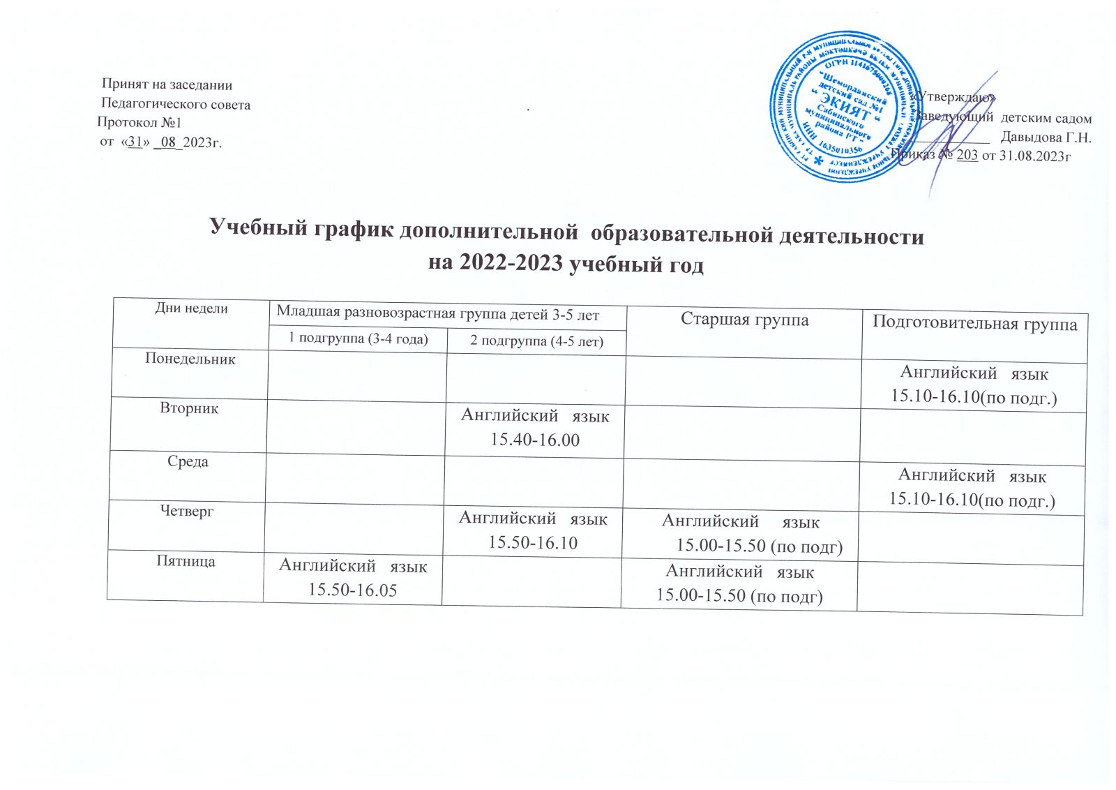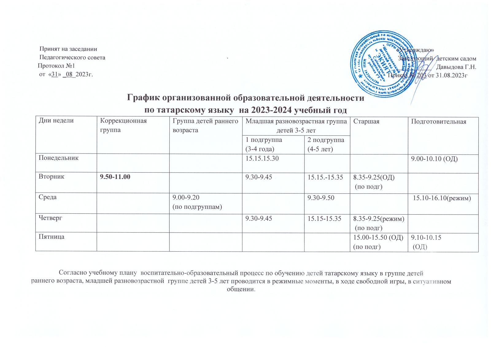 Расписание организованной образовательной деятельности по татарскому языку на 2023-2024 учебный год
