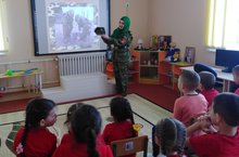 Бүген без зурлар төркеме белән солдатта булып кайттык. Шөгылебезнең башында безгә сержант апа килде. Ул солдатның киемнәре, солдат уставлары һәм үзенчәлекләре турында сөйләде. Балалар бик кызыксынып тыңладылар, сораулар бирделәр. Солдат апа армия үзенчәлекләре, ничә яшьтән армиягә алалар, нинди хезмәт итә торган бүлекләр барлыгын әйтте. Җирне, күкне һәм диңгезне саклаучылар барлыгын әйтте. Балалар шөгылебез ахырында бергә "Солдатта булган, диләр",- дип җыр башкардылар.