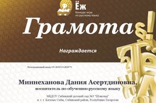 Конкурс-игра проводилась по возрастным группам, где дети в свою очередь, прошли сквозь тернии грамматических задач, проверили свои знания и посоревновались со сверстниками, и были признаны победителями, набрав 58 баллов. Место в конкурсе-победитель, место в субъекте РФ/стране-1, место в населённом пункте-1. Поздравляем воспитателя по обучению русскому языку Миннеханову Д.А. и конечно же наших детей!