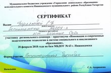 Воспитательница нашего детского сада Фарляхова Г.Ф. приняла участие в семинаре-практикуме в городе Нижнекамск по теме: "Инновации и современные педагогические технологии в системе специального и инклюзивного образования".