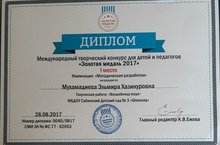 Воспитательница нашего детского сада Мухаммадиева Э.Х. приняла участие в международном творческом конкурсе "Золотая медаль-2017" . Она предложила членам жюри творческую работу по теме: "Волшебница вода" и была награждена дипломом 1 степени. Поздравляем нашу коллегу!!! Эльмира Хазинуровна, желаем вам дальнейших творческих успехов!