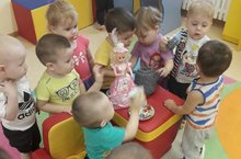Воспитатели группы раннего возраста продолжают устанавливать с детьми эмоционально - положительный контакт, закрепляют у детей желание действовать совместно со взрослыми. Вот и сегодня к ним в гости пришла кукла Катя. Дети угостили её бараниками. Они на манке указательным пальцем нарисовали круги – баранки. А воспитатель читала потешку. Таким образом, у детей развивался словарь, а также малыши получили огромное удовольствие от игры с куклой Катей.