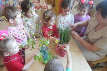 С наступлением каникул воспитанники первой младшей группы под руководством воспитателя создали свой «палисадник на окне». Они заранее насыпали грунт в пластиковые ящики и лотки, посадили лук. В целях наблюдения были посажены ветки берёзы на воде . В течении недели следили как прорастают их «палисадник». В дневнике наблюдении отмечают появление первых листьев.