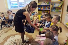 К воспитанникам старшей группы в гости приехала Helen, дети познакомились с ней, поздоровались, назвали свои имена, отвечали на вопросы по-английски, спели песню и потанцевали. Наша гостья приехала не с пустыми руками, а привезла magic bag полный осенним урожаем. Дети доставали из волшебного мешка овощи, фрукты и называли их по-английски, если ребенок правильно произносил, все дружно хлопали в ладоши. В конце ребята поблагодарили Helen и позвали ее в гости.