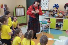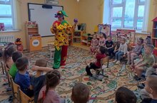 Сегодня Клоун развлекал детей средней группы. Он принес игрушки, приготовил интересные задания, смешил детей своими выдумками и развлек их мыльными пузырями. На занятии царило настроение радости и веселья, все получили заряд положительных эмоций. Девчонки и мальчишки пригласили Клоуна прийти ещё раз к ним в гости.