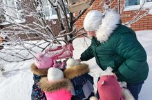 Икенче кече яшьтәгеләр төркеме балалары үзләренең җимлекләре янына килгән кошларны тәрәзә аша күзәтеп торалар. Кошлар өчен җимлекләргә көн саен ризык салалар. -