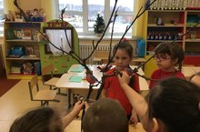 Бүген икенче кечкенәләр төркеме балалары (тәрбияче Шамсутдинова Л.М) кисеп ябыштыру шөгылендә кышкы урманга сәяхәт кылдылар. Шунда бер Кар бабайның үзенә дуслар эзләгәнен күрделәр. Һәм инде традицион булмаган ысул белән, түгәрәк мамык кулланып Кар бабайлар ясадылар. Шөгыль ахырында бергәләшеп Кар бабай турында җыр җырладылар.