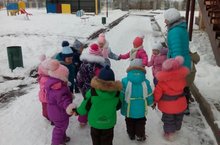 Прогулка на свежем воздухе в сочетании с подвижными играми и занятиями физическими упражнениями создаёт прекрасные условия для оздоровления детей, а также положительно влияет на эмоциональное состояние. Для того, чтобы дети охотно оставались на прогулке положенное по режиму время, необходимо им создать условия для разнообразной деятельности. Воспитатель заранее продумывает её содержание, вызывает у малышей интерес к ней с помощью игрушек или рассказа о том, чем они будут заниматься. На фото дети свторой младшей группы с Айсиной Айратовной во время прогулки.