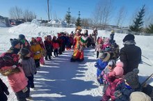 Всю неделю дети готовились к этому событию и ждали его с нетерпением. На занятиях они узнали, как раньше на Руси праздновали Масленицу, что означает и откуда берет начало этот обычай. С веселыми кричалками, частушками, хороводами и русскими народными песнями встречали Масленицу воспитанники средней , старшей и подготовительной группы. Создать атмосферу поистине народного гуляния помогли несложные аксессуары. Детей нарядили в яркие русские костюмы, от чего они пришли в неописуемый восторг. Программа развлечения получилась очень веселой. К ребятам на Масленицу заглянула красавица Весна, Солнышко, скоморохи, которые под звуки русской музыки устроили для всех ребят соревнования. Как положено на празднике, дети от души веселились: водили хоровод вокруг масленицы, пели русскую народную песню "Блины", частушки, скоморохи исполняли потешки.