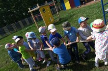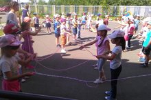 Это неделя посвящена спортивным играм. Каждый день в нашем ДОУ проводятся тематические спортивные игры. Сегодня дети соревновались в быстроте и ловкости на эстафете " Веселые старты".