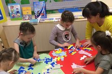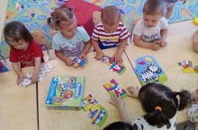 Бүген, нәниләр төркемендә “Төзү матераллары “ дигән темага шөгыль узды.Түбәндәге максатлар куелды: агачтан зур кубикларны бер-берсенә тезеп өй ясау, агач материалы,аның үзенчәлекләре(каты,нык булуы) белән таныштыру, предметларның төсен,формасын,зурлыгын билгеләргә өйрәтү, бер-береңә дустанә мөнәсәбәт , хөрмәт тәрбияләү. Балаларга мондый уен аеруча ошады. Башта зур фигуралардан өй төзеделәр, төсләр белән таныштылар. Аннары өстәл артында һәркем агачтан ясалган кубиклардан, фантазиясенә таянып төзүче булып уйнады. Шөгыль бик күңелле, актив, мавыктыргыч булды.