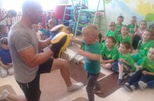 У нас сегодня большое событие: к нам сегодня пришли настоящие спортсмены - КМС по боксу призер Европы по пауэрлифингу Азат Валиуллин и его молодые спортсмены призеры Татарстана по пауэрлифингу и боксу Камиль Шагеев, Искандер Галимов и Азат Хадиев. Чемпионы показали навыки бокса и рассказали детям о том, как быть ловкими,здоровыми и спортивными.