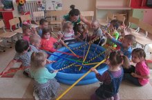Балалар күңелен күрергә күп тә кирәк түгел.Су белән уйнау алар өчен иң яраткан шөгыльләрнең берседер,мөгаен.Шуларны истә тотып, бүген беренче кечкенәләр төркеме балалары тәрбиячеләре белән берлектә, суда уенчыклар йөздереп уйнадылар.Аларның исемнәре ,төсләре,күләме кабатланды.Суга батырганнан соң кире өскә калыккан уенчыкларны күргәч,аларның күңелләре тагын да күтәрелеп китте.Атналыкның темасы”Суның тылсымлы дөньясы” дип атала.Шунлыктан бу атнада балаларга суның әһәмияте: агачларга,үлән-чәчәкләргә ни өчен су кирәклеге һәрдаим ассызыкланып торыла.