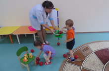Ребята ясельной группы вместе с воспитателем Сириной Басировной собирают яблоки.