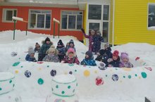 Снежные фигуры и постройки украшены кружочками и полосками из ткани. Для украшения мы применяли ветошь, не использовали краску. Весной при таянии снега краска попадает на почву. Так как в красках много вредных для почвы элементов мы стараемся не применять их. Ещё краски пачкают одежду детей. А ветошь собираем весной, при желании можно применять несколько лет.