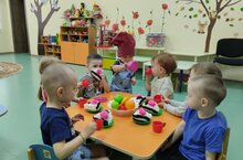 В первой младшей группе прошла игра «Кафе», обучающая детей правилам сервировки стола, а также вежливости, внимательности и аккуратности. В процессе игры дети познакомились с профессиями повара, официанта, примеряли на себя роль гостей. Также закрепляли знания об овощах, фруктах, продуктах питания, посуде.