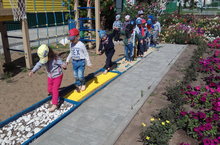 Упражнения с массажными ковриками и дорожками создают положительный настрой, повышают настроение, дают заряд бодрости и энергии. В летнее время малыши нашего садика укрепляют свое здоровье проходя по массажной дорожке из природных материалов и бросового сырья.