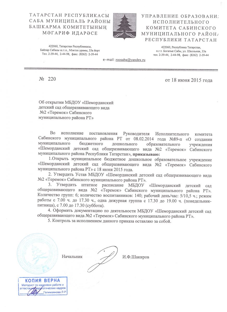 Приказ об открытии МБДОУ №2 "Теремок"