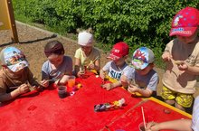 Җәйнең кояшлы көннәрен зарыгып көтеп алдык. Балалар белән рәхәтләнеп саф һавада уйныйбыз, җәйге табигатьне күзәтәбез, матурлыкка сокланабыз. Табигать белән тагын да дуслашу, андагы төсләрне тагын да якыннан өйрәнү өчен ачык һавада рәсем шөгыле уздырдык. Балалар төсле буяулар белән ташларны буядылар, ташка матур бизәкләр ясадылар.
