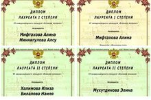 Халимова Муслима- Мухутдинова Элина (преп.Мухутдинова Э.Н.)- Лауреат III степени;