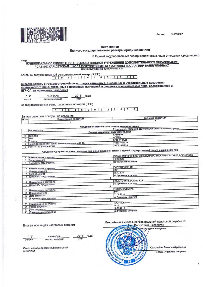 Лист записи ЕГРЮЛ на 19.09.2018г.