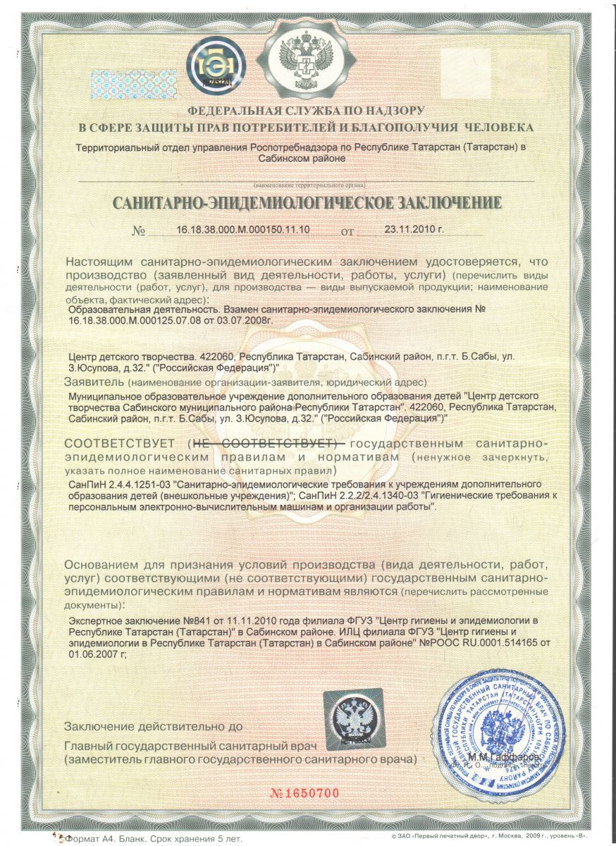Санитарно-эпидемиологическое заключение ЦДТ (общее здание)