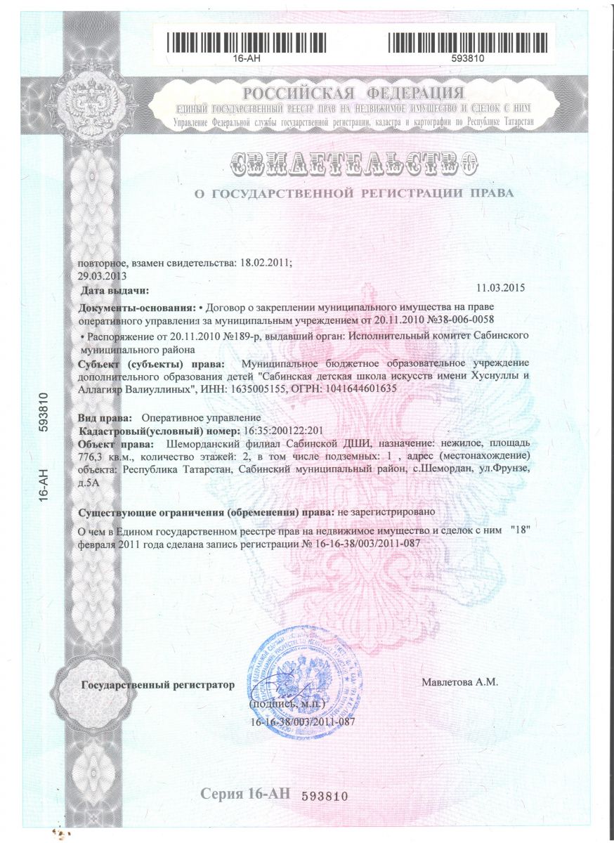 Свидетельство регистрации права на здание Шеморданского филиала ДШИ