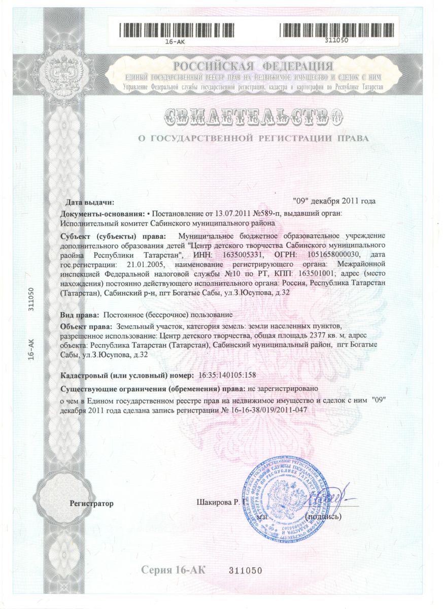 Свидетельство регистрации права на земельный участок МБОУ ДОД "ЦДТ" (общее здание)