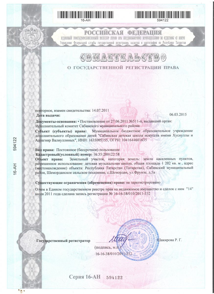 Свидетельство регистрации права на земельный участок Шеморданского филиала ДШИ