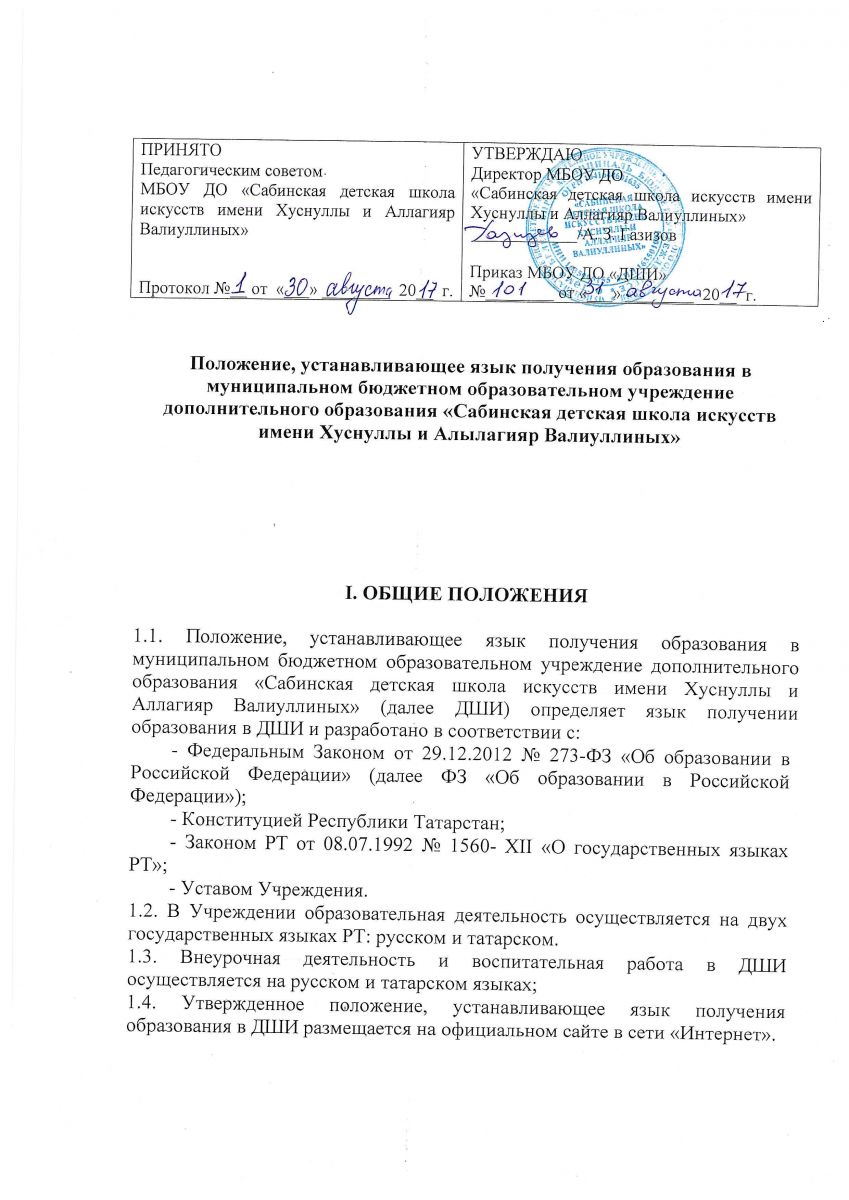 Положение, устанавливающее язык получения образования в МБОУ ДО "ДШИ"