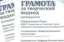 В первом полугодии текущего учебного года прошел Республиканский этап 19-ой Всероссийской олимпиады научно-исследовательских и учебно-исследовательских проектов детей и молодежи "Созвездие-2018", где обучающиеся Сабинской гимназии - Габдрахманов Раиль и Мубаракзянов Ильназ, под руководством Сайфеевой И.Ф., стали победителями конкурса и были награждены грамотами за творческий подход.