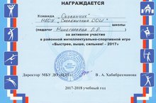7 нче сыйныф укучылары Балалар иҗат үзәге үткәргән "Быстрее,Выше,Сильнее-2017" уенында актив катнашып мактау грамотасына һәм сертификатка ия булдылар. Молодцы укучылар. Сез булдырасыз!.
