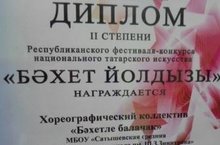Чаллы шәһәрендә узган " Бәхет йолдызы" конкурсында катнашып , "Бәхетле балачак" бию коллективы (җитәкчесе Аухадиева Н.А.) II дәрәҗәдәге дипломга лаек булдылар. Молодцы, укучылар! Сезгә алда да зур үрләр яулап алуыгызны теләп калабыз.