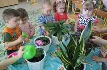 Основной целью трудового воспитания наших маленьких воспитанников, с учётом их возрастных особенностей, является формирование положительного восприятия труда и умения выполнять посильные трудовые действия. С этой целью дети первой младшей группы во время режимного момента знакомились с правилами ухода за растениями. Детям объяснили, что растениям. необходимы вода и свет, что за ними нужно ухаживать, поливать, опрыскивать. Так с малого начинается воспитание трудолюбия, ответственности за порученное дело.