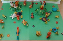 Так и в нашей работе дети учились создавать коллективными усилиями несложную сценку из вылепленных фигур - петуха, куриц и цыплят. Закрепляли умения лепить петуха, кур, цыплят. Старались добиться большей точности в передаче основной формы, характерных деталей. А также учились коллективно обдумывать расположение птиц на подставке.