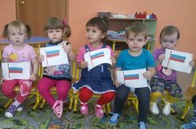 В рамках темы недели воспитанники первой младшей группы во время режимного момента сделали аппликацию флага России. Во всех группах проходят беседы и мероприятия призванные воспитанию любви к близким людям, к детскому саду, к родному краю и к родной стране, культурному достоянию своего народа, своей нации и толерантного отношения к представителям других национальностей, воспитание уважительного отношения к труженику и результатам его труда, родной земле, защитникам Отечества, государственной символике, традициям государства и общенародным праздникам.